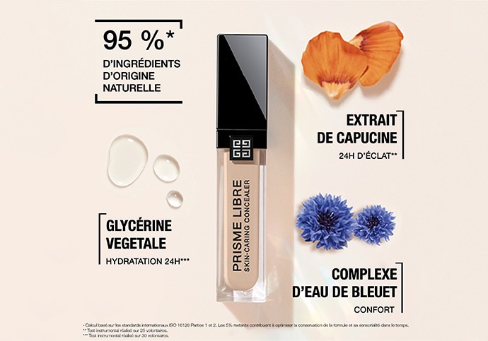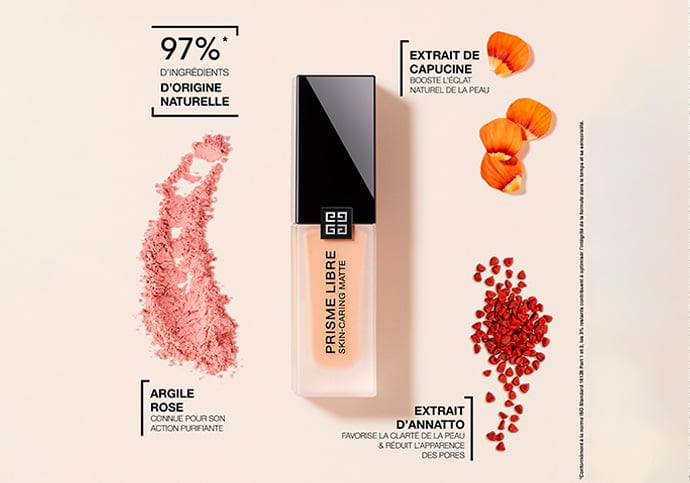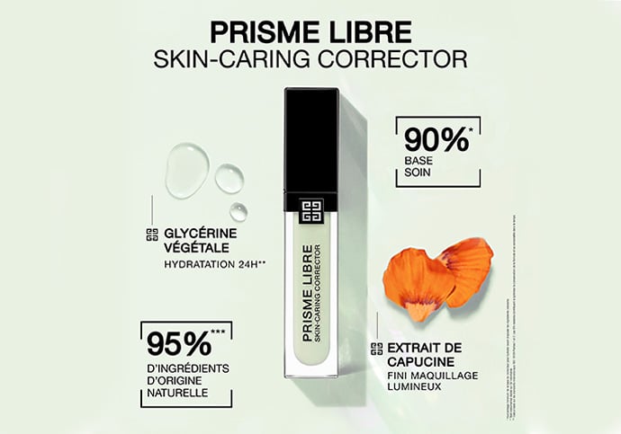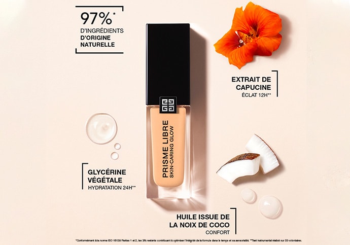 Forte de 30 années d’expertise dans l’éclat de la peau, la Maison Givenchy crée le premier fond de teint soin au sein de la gamme Prisme Libre, disponible en 30 teintes. Composée à 97 % d’ingrédients d’origine naturelle*, la formule Prisme Libre Skin-Caring Glow offre une couvrance parfaite, un fini lumineux et une action hydratante.