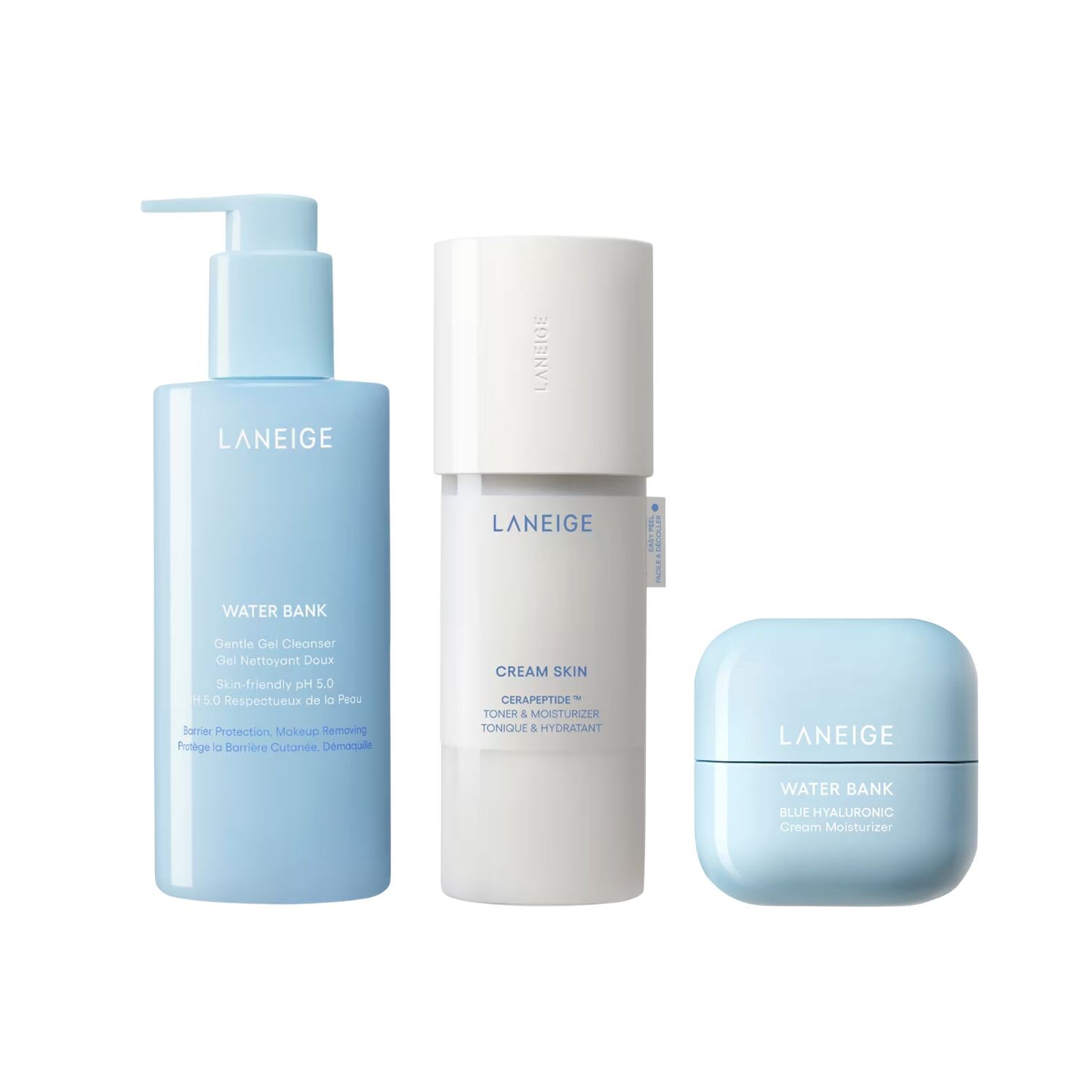 Cette routine contient le Gel Nettoyant Doux Water Bank, la lotion tonique et hydratante Cream Skin Cerapeptide Short Cap et la crème hydratante Water Bank Cream Moisturizer.
