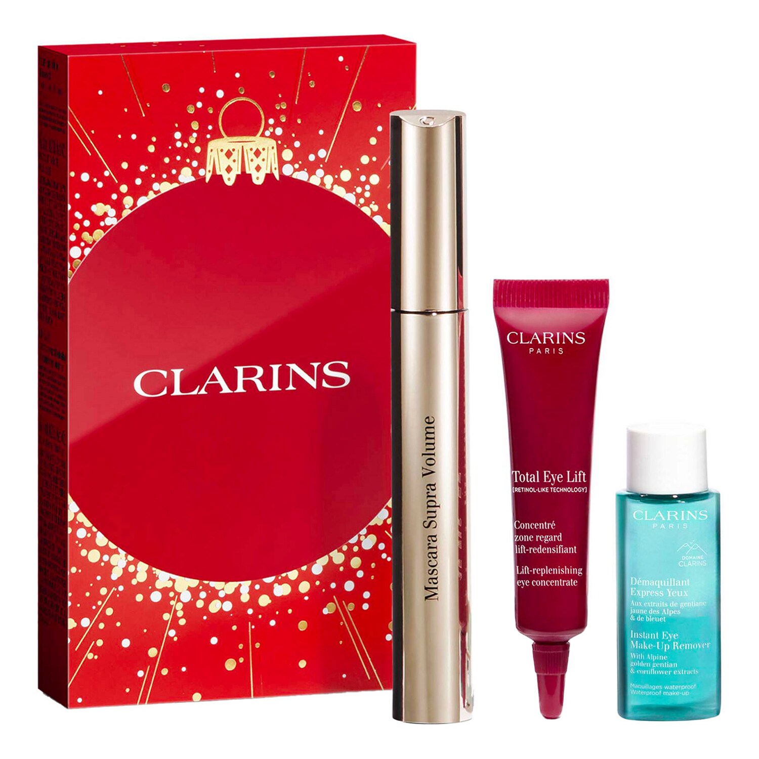 - Démaquillant Express Yeux – échantillon (10 ml)Le coffret idéal pour prendre soin de sa zone regard. Du maquillage et du soin rien que pour vos beaux yeux... Côté maquillage, le mascara Supra Volume sublime vos cils en les étoffant intensément. Il renforce le pouvoir de votre regard avec sa couleur intense. Des cils volumisés grâce à l'action d'un cocktail de cires végétales. Au fil des applications, les cils nus sont comme épaissis grâce au complexe soin «Boosteur de volume». Le Démaquillant Express Yeux élimine impuretés et maquillage tout en douceur. Côté soin, pour le contour de l'œil si fragile, le nouveau Total Eye Lift aide à visiblement lifter et lisser les rides. Il contribue aussi à redensifier la peau. Sa formule PRO-TIGHTENING MATRIX forme un maillage tenseur sur la peau pour un effet liftant instantané. Son étui recyclable* est imprimé sur du papier issu de forêts gérées durablement. *Selon les consignes locales.