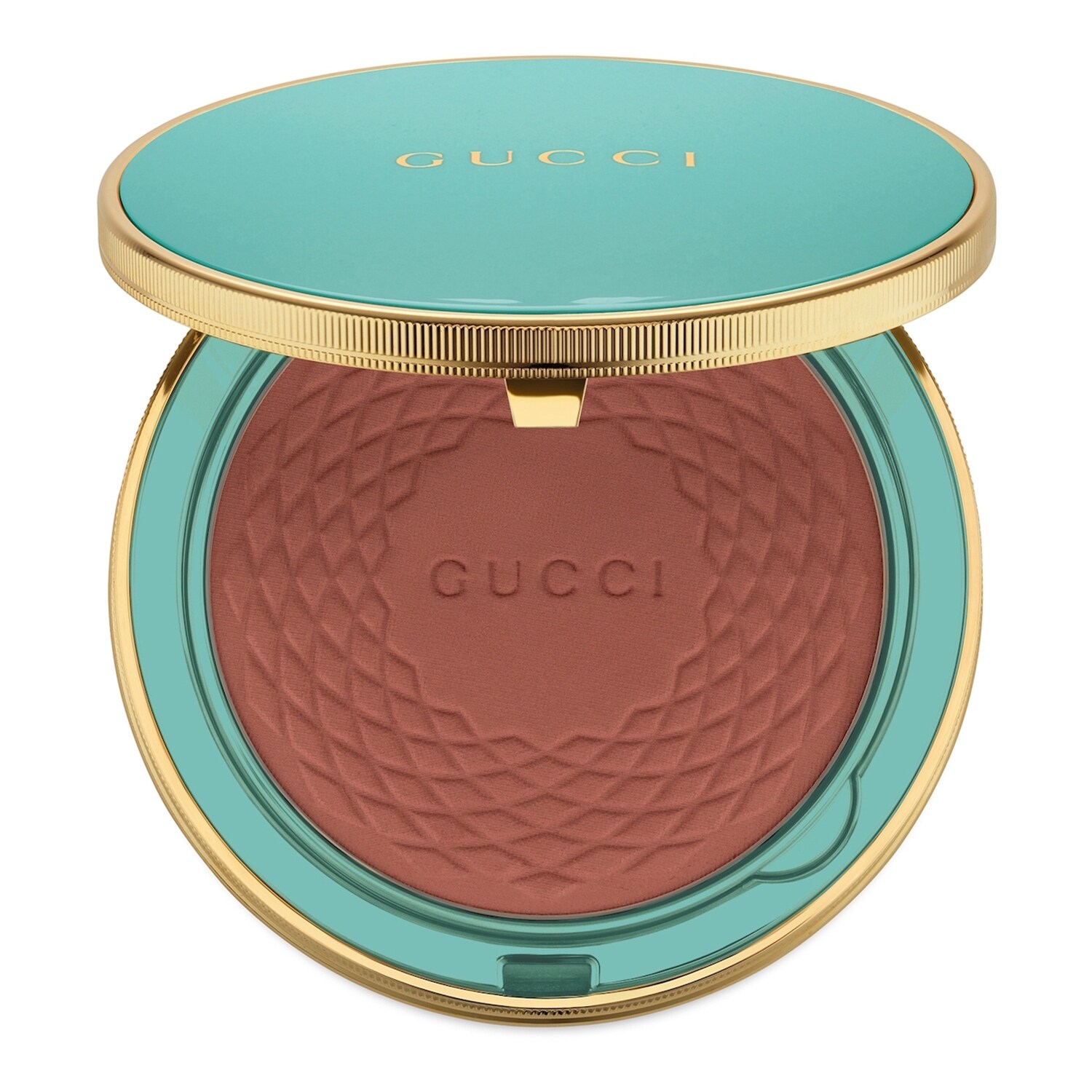 Disponible en cinq teintes, Poudre De Beauté Éclat Soleil se présente dans un poudrier bleu turquoise et doré, accompagné d’un applicateur.