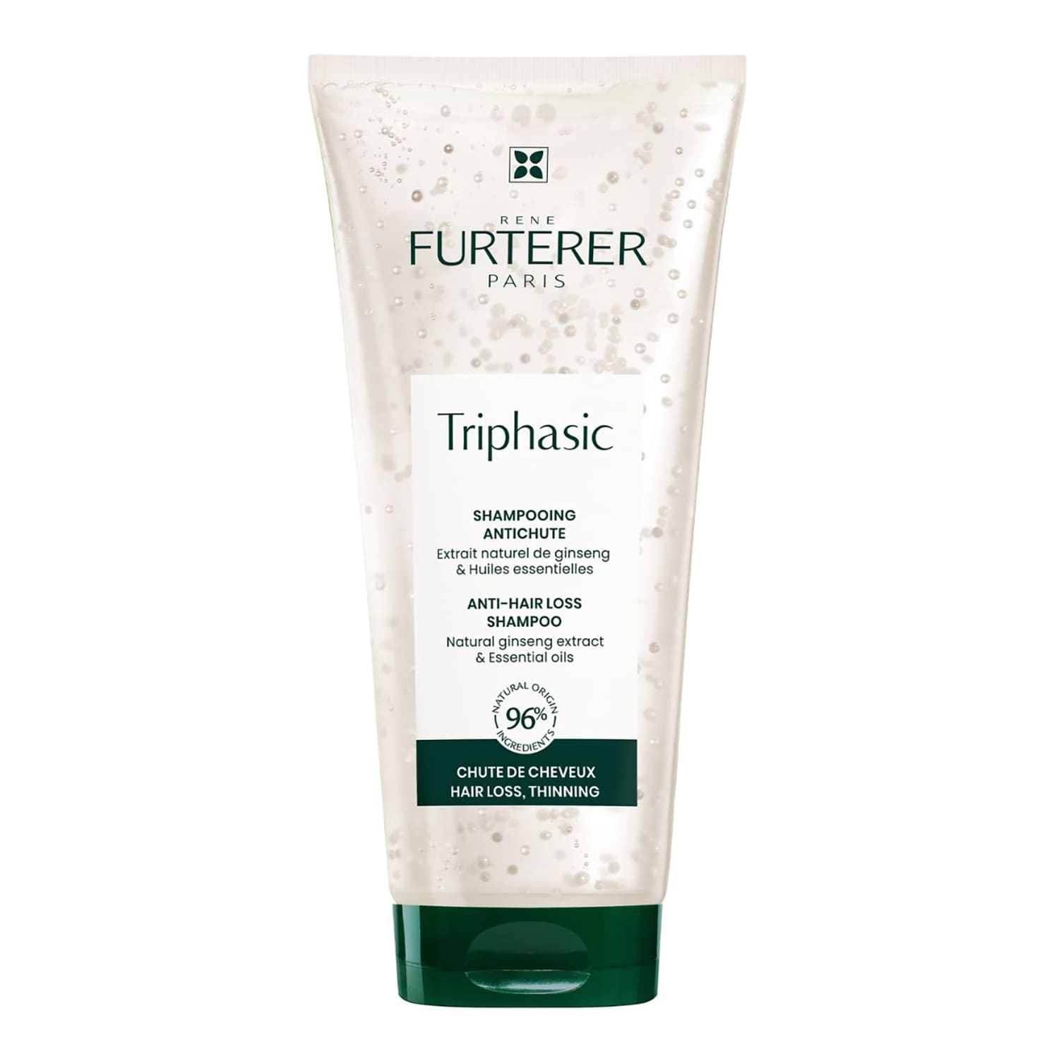 Lire la suiteLe Shampooing traitant antichute TRIPHASIC réduit la chute de cheveux sans agresser le cuir chevelu. Sa formule sans silicone associe la Vitamine B5, les extraits naturels de Pfaffia bio et de Ginseng qui contribue à tonifier le cuir chevelu, et aux pouvoirs stimulants des Biosphères d'huiles essentielles pour freiner la chute et favoriser la pousse de cheveux plus denses, plus épais. La texture transparente du produit laisse apparaître ces Biosphères blanches et nacrées, qui éclatent délicatement sous les doigts au moment du shampoing. Nettoyés en douceur et plus résistants, les cheveux sont faciles à démêler, doux et brillants. 96% d'ingrédients d'origine naturelle. Sans silicone, sans tensio-actifs sulfatés. Formule biodégradable(1).